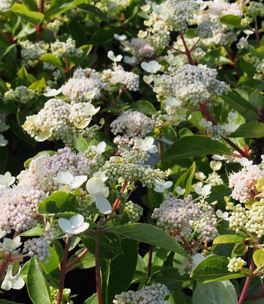 - Kvety: Kvetenstvo tvorí vzdušné, ploché metliny zložené z veľkých sterilných kvetov a drobných fertilných kvietkov, ktoré jemne voňajú. Pri rozkvete sú kvety snehobiele až krémové, no veľmi skoro sa začínajú vyfarbovať do sýtej staroružovej až tmavočervenej farby, čo vytvára dynamický farebný efekt.