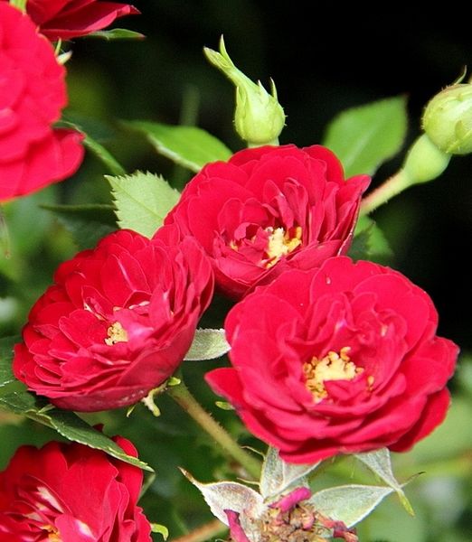 Kvety: Malé, plné kvety v tvare rozety so zamatovou, sýto červenou farbou. Sú usporiadané vo veľkých trsoch.